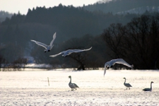 群れになっていた白鳥が1羽、また1羽と飛び立っては旋回し戻ってくる。